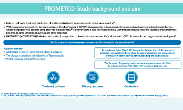 The purpose of PROMETCO is to provide real-world data on overall survival, treatment patterns, associated effectiveness and safety, and impact on patients with mCRC throughout the continuum of care1